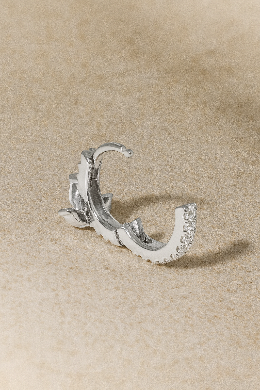 Our 925 sterling silver single lotus earring is accented by glittering claw-set round-cut white CZ stones that encircle the band and adorn the central lotus. It is then finished with a hinged-hoop fastening to hold it snug against the earlobe.