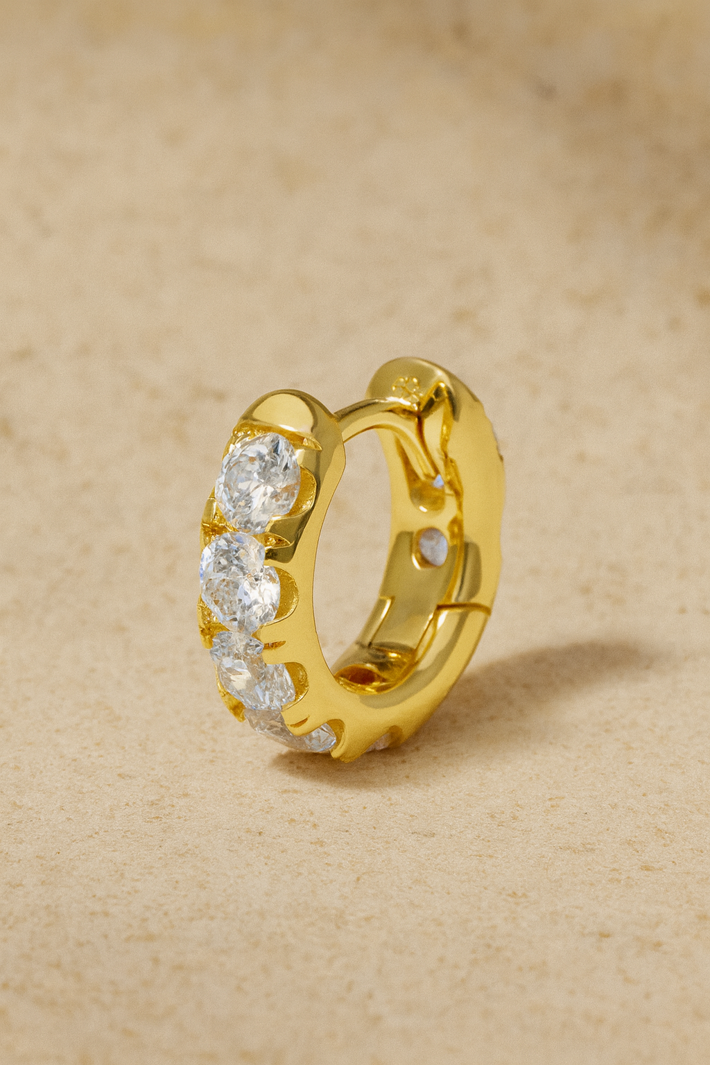 This statement single hoop earring is cast from polished 925 sterling silver, 18ct gold plated. It is encrusted with five brilliant-cut white cz stones in the front and two more in the back. Wear it stacked with other styles from our Ear Stories Collection.