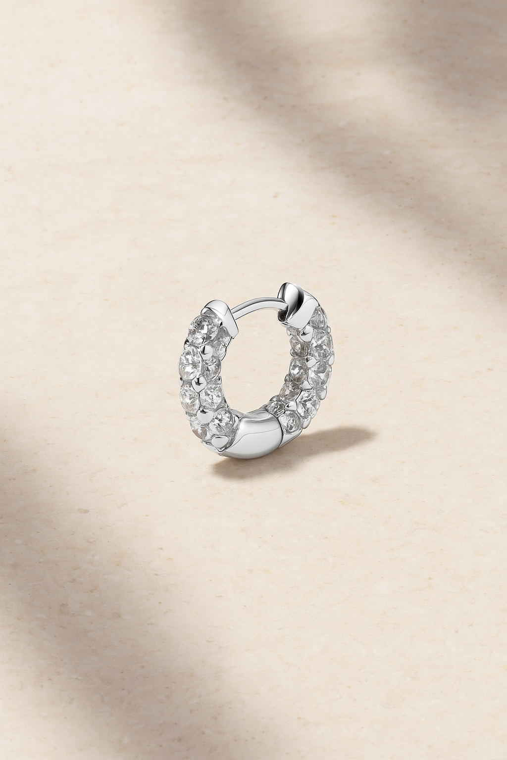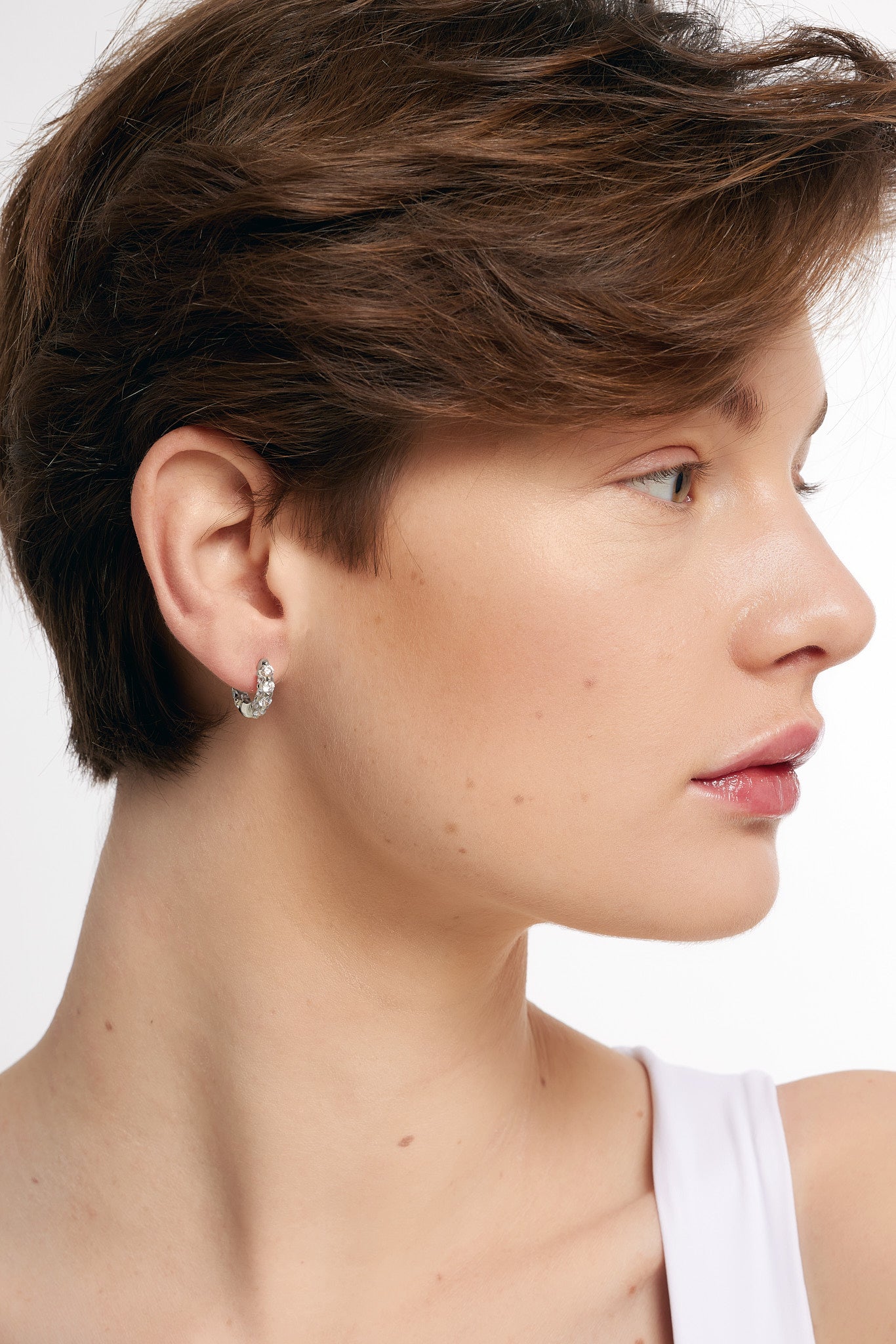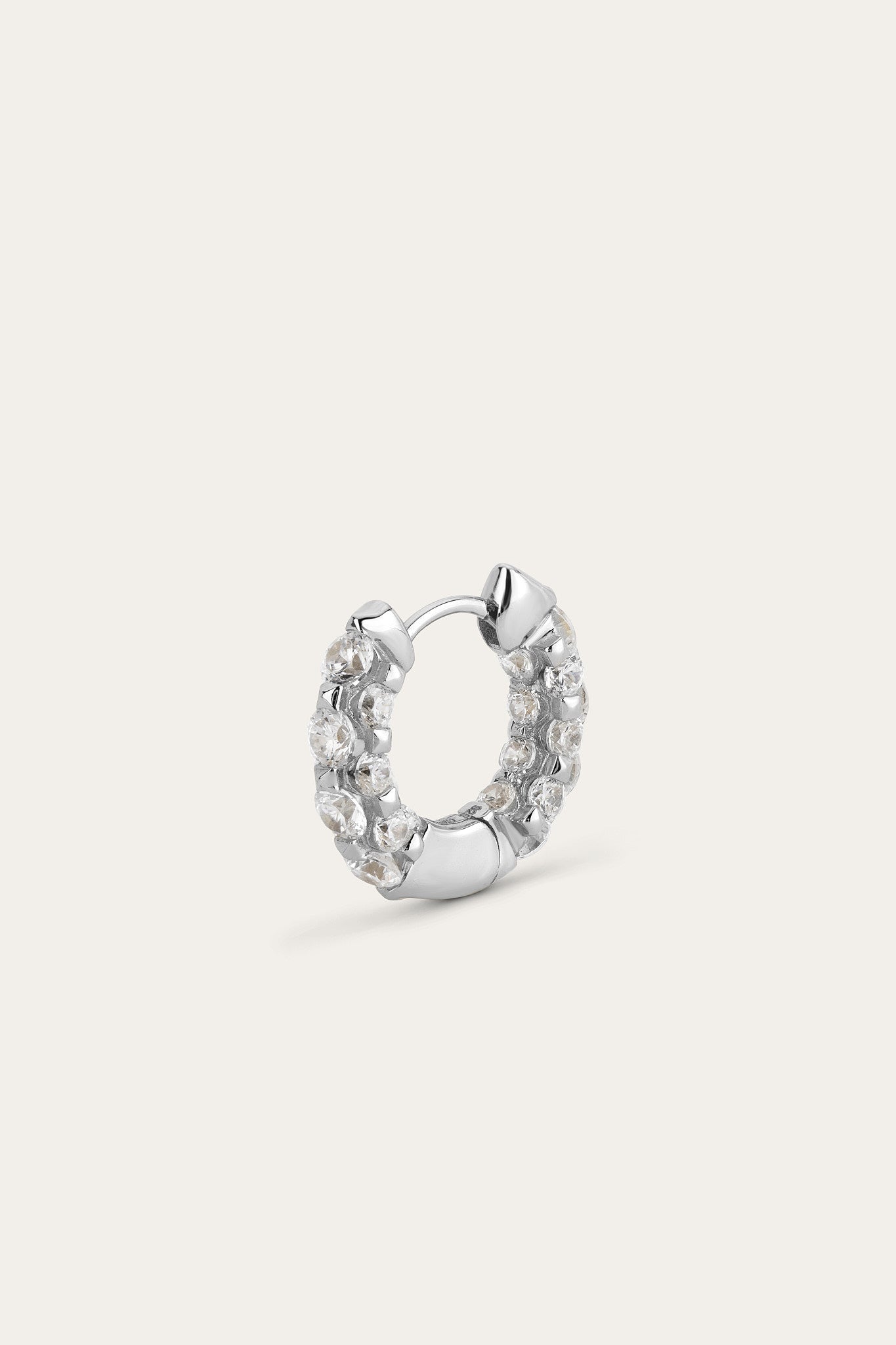 This go-big 8.5mm huggie is cast from 925 sterling silver and encrusted with shimmering white CZ stones inside and out. Wear it with the matching Gatsby ring.