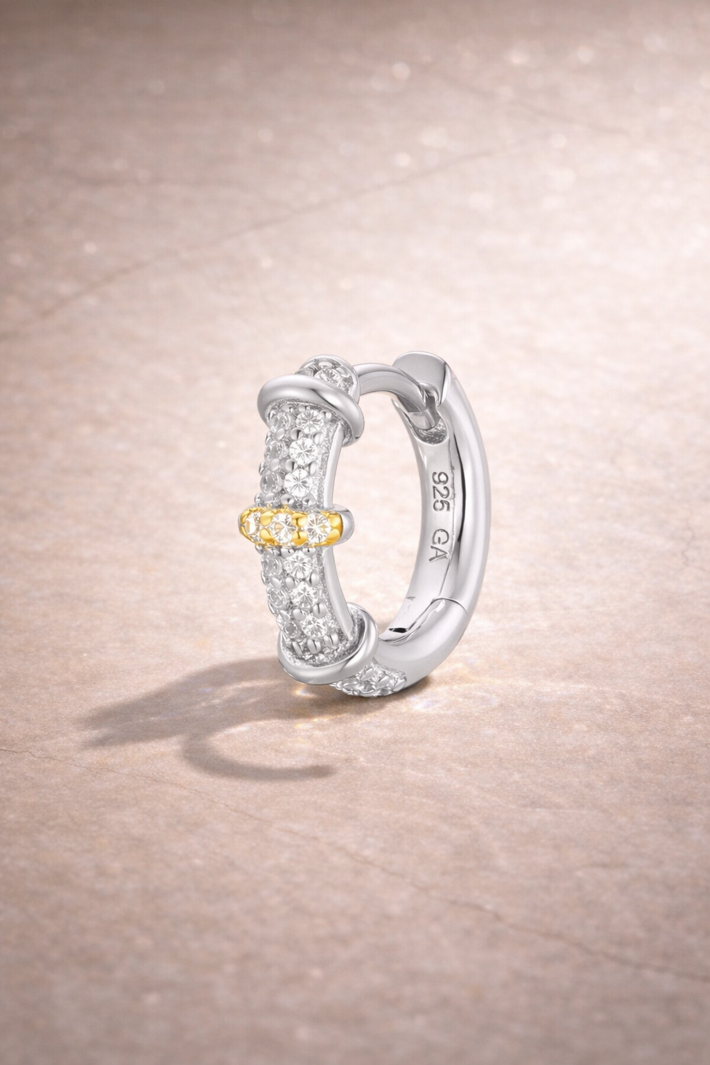 A signature huggie gets a modern mixed-metal twist. Crafted in rhodium-plated 925 sterling silver with a single 18ct gold pavé cross-bar, this dainty hoop is a statement in contrast and craftsmanship.