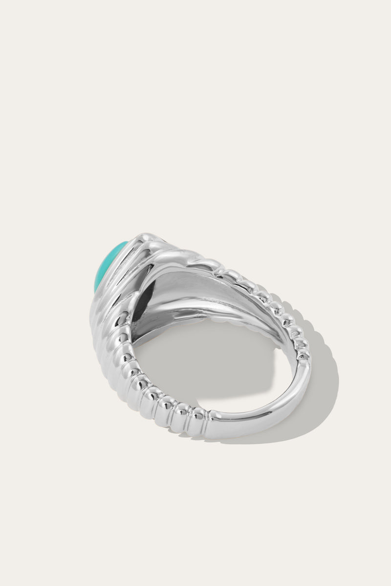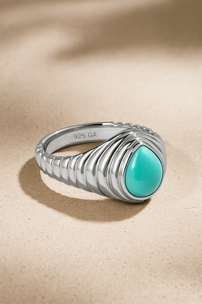 Elevate your style with our Ridge Teardrop Turquoise Silver Ring. Part of our exclusive ridge collection, its perfectly textured design adds a touch of sophistication to any outfit. Let the vibrant turquoise gemstone bring a sense of luxury to your everyday look.