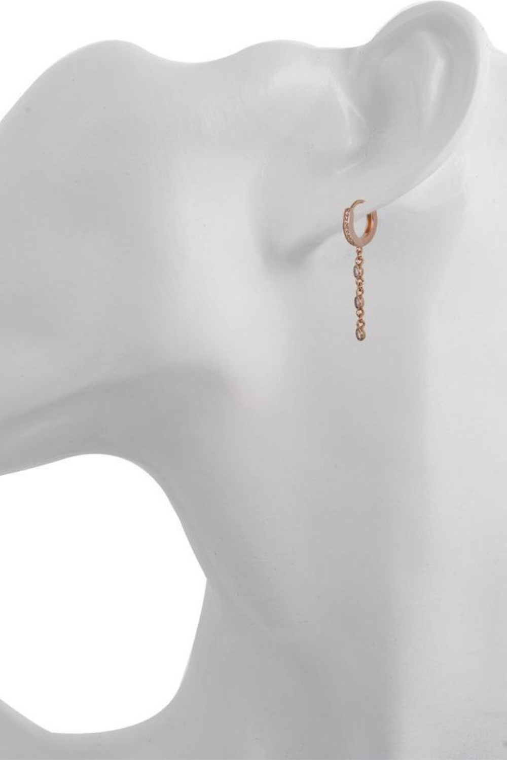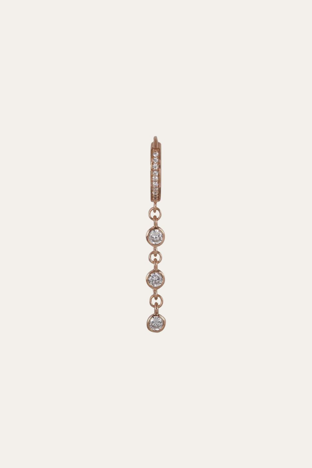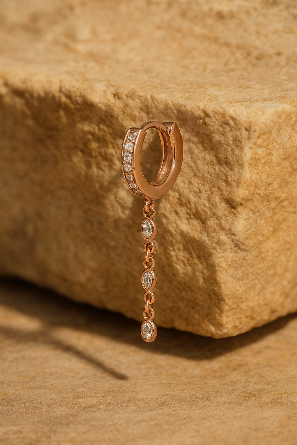 Our Ear Stories Collection is designed to mix and match styles and colors to create an individual & unique look.This beautiful piece is made from 925 sterling silver, paved with an array of shimmering white cz stones encrusted around the hoop. Dangling from the layered chain, there are three bezel set sparkling white cz stones. Wear it everyday and make it your signature piece.